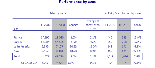 Ο Όμιλος Carrefour (o δεύτερος Όμιλος λιανικής στην παγκόσμια κατάταξη και πρώτος στην ελληνική αγορά) ανακοίνωσε τα αποτελέσματα πρώτου εξαμήνου 2010 (Για την πορεία του Ομίλου το 2009 βλπ. άρθρο μας Όμιλος Carrefour: Προβληματισμοί για την πορεία του 2009, νέο προωθητικό πρόγραμμα με πρωταγωνιστή τον πελάτη και η τύχη της Dia στην Ελλάδα.).